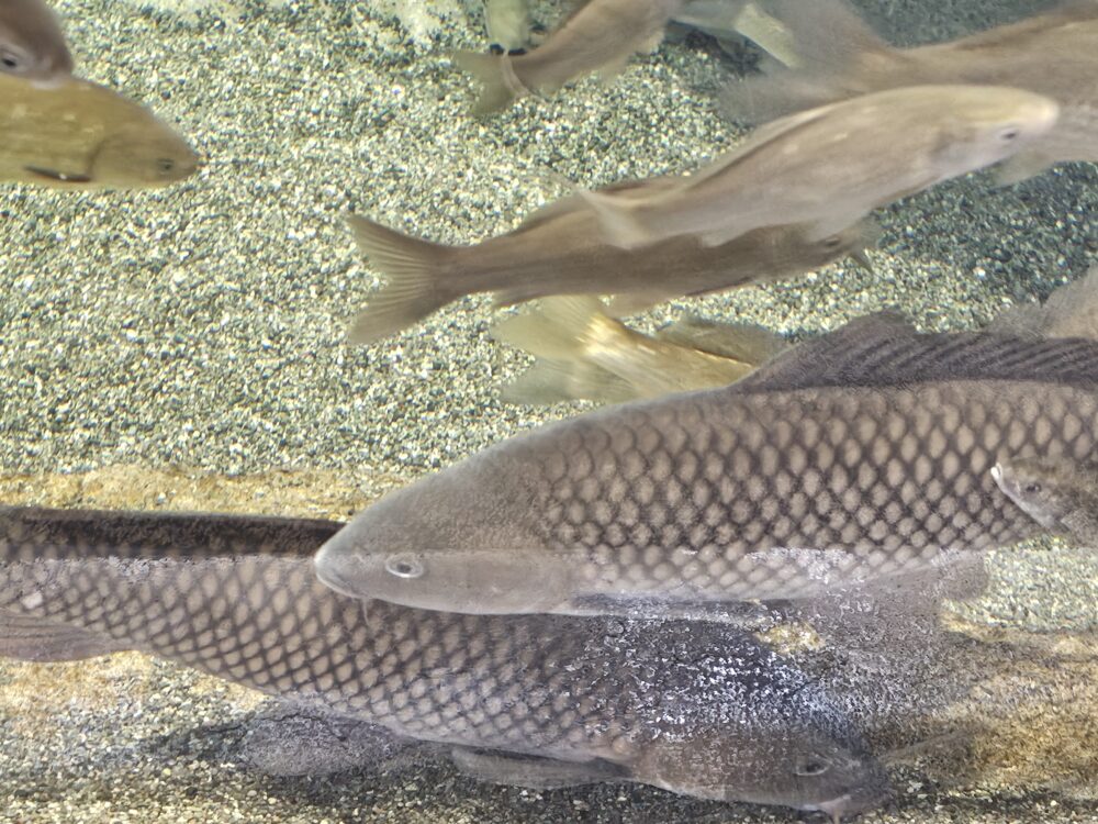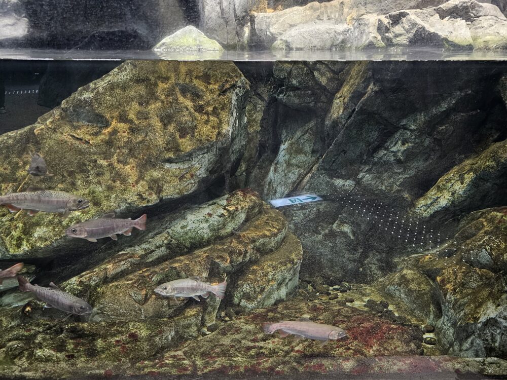 海水魚の華やかさとは違う、落ち着いた魅力があります。日本の河川に生息するヤマメやイワナ、そして巨大なコイなど、様々な淡水魚が展示されています。