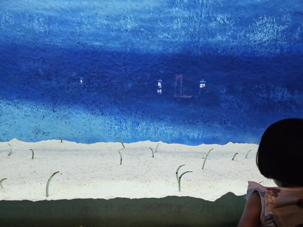 娘も、たくさんのチンアナゴが不思議な存在であり、興味深い生き物と思ったのか水槽の前でしばらく釘付けになっていました。