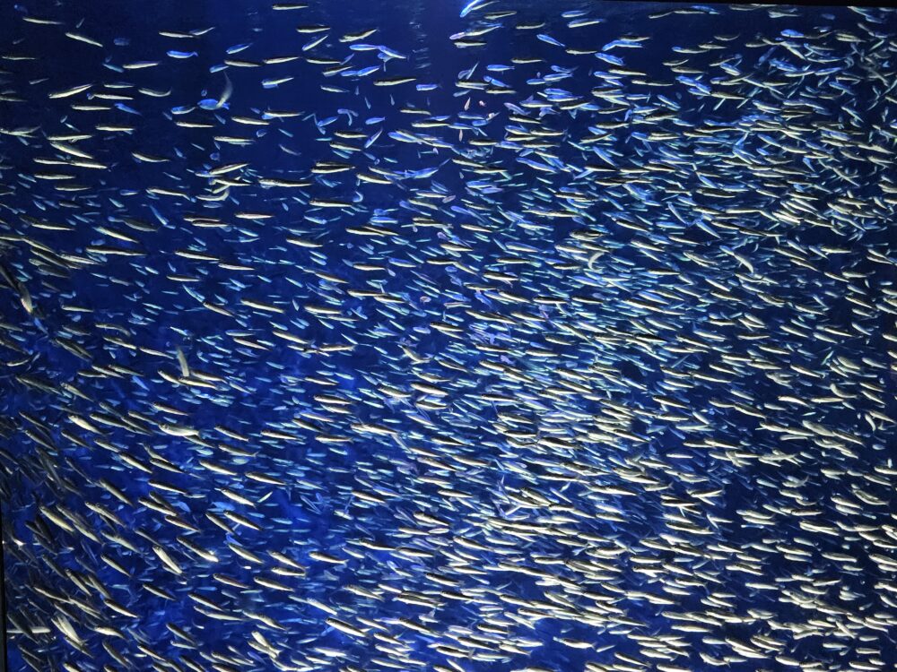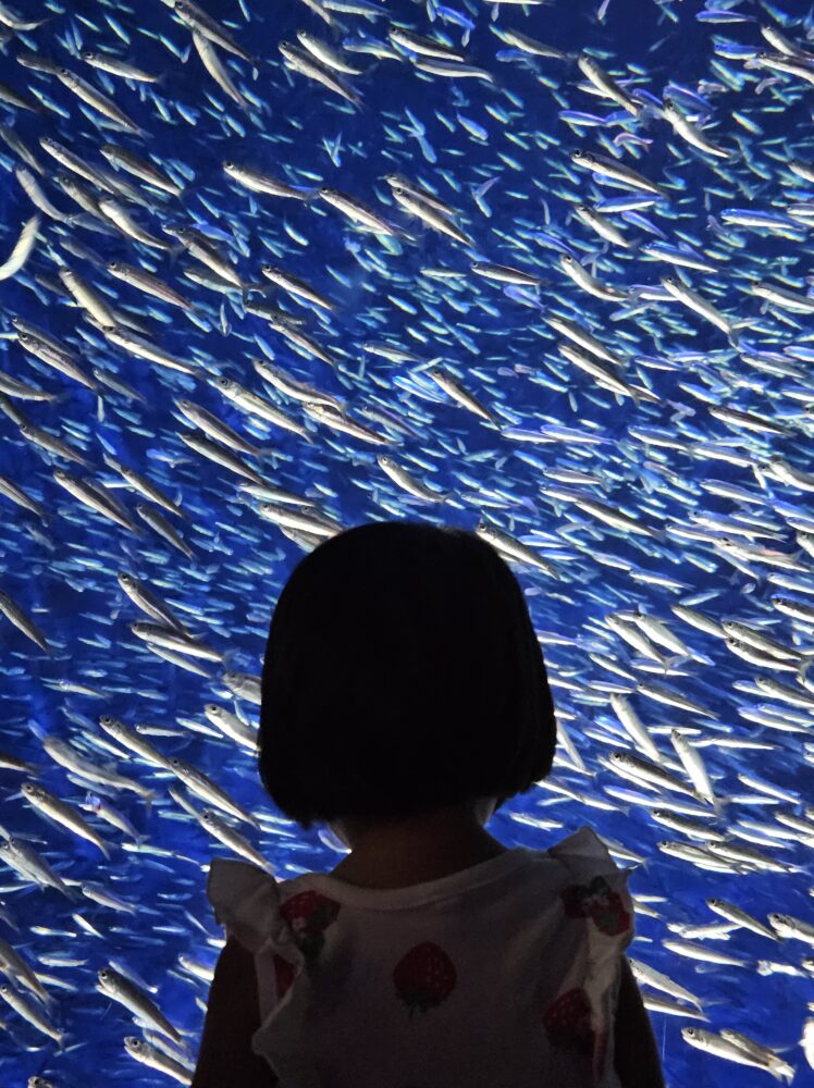 館内の中間ほど、目の前に巨大な水槽が現れました。その中には数え切れないほどのイワシたちが、まるで一つの生き物のように渦を巻きながら泳ぐ、圧巻の光景を見ることができます。