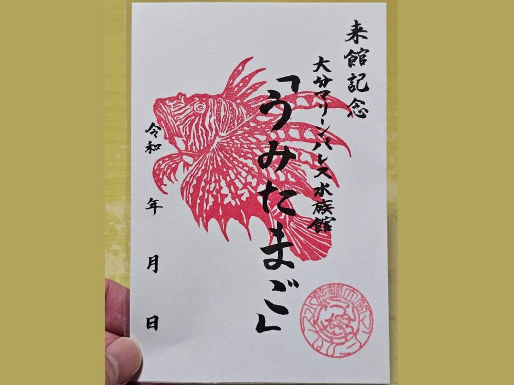 これは、神社の御朱印(ごしゅいん)のように、魚のイラストや名前がスタンプされた水族館オリジナルの記念符です。